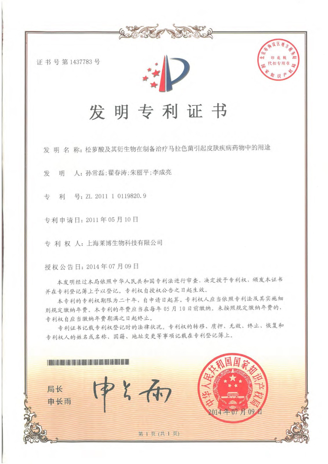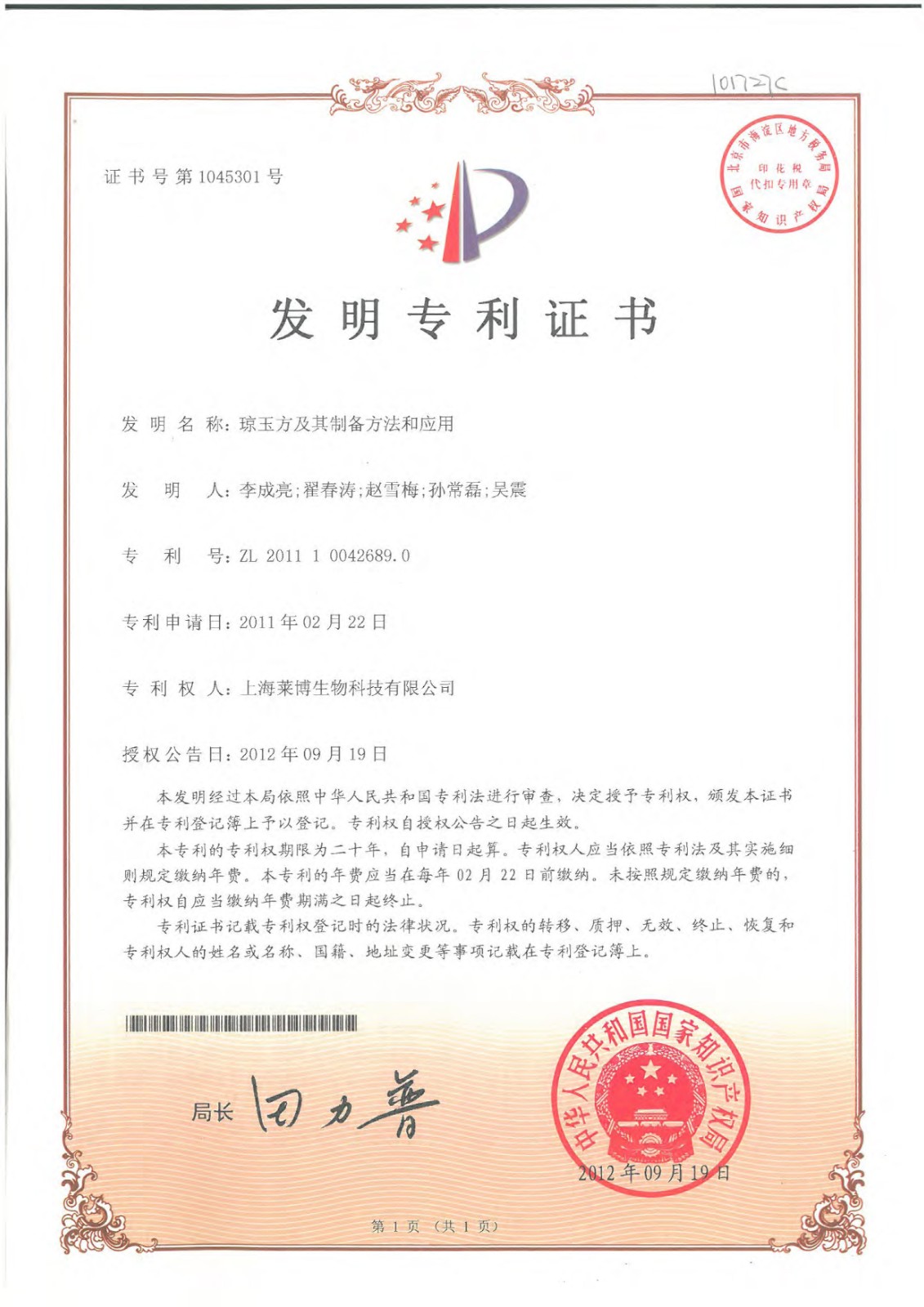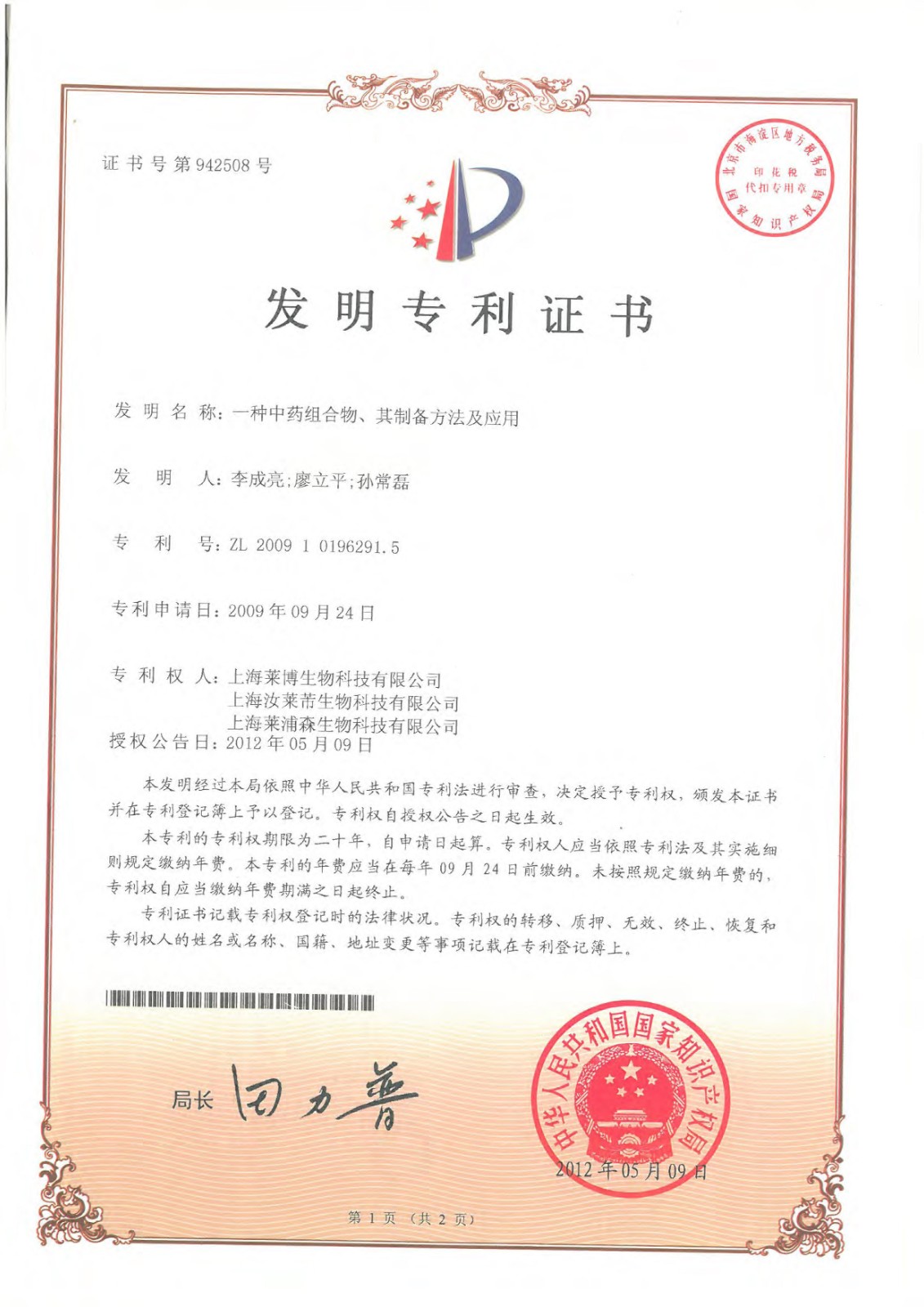 超过50项专利证书